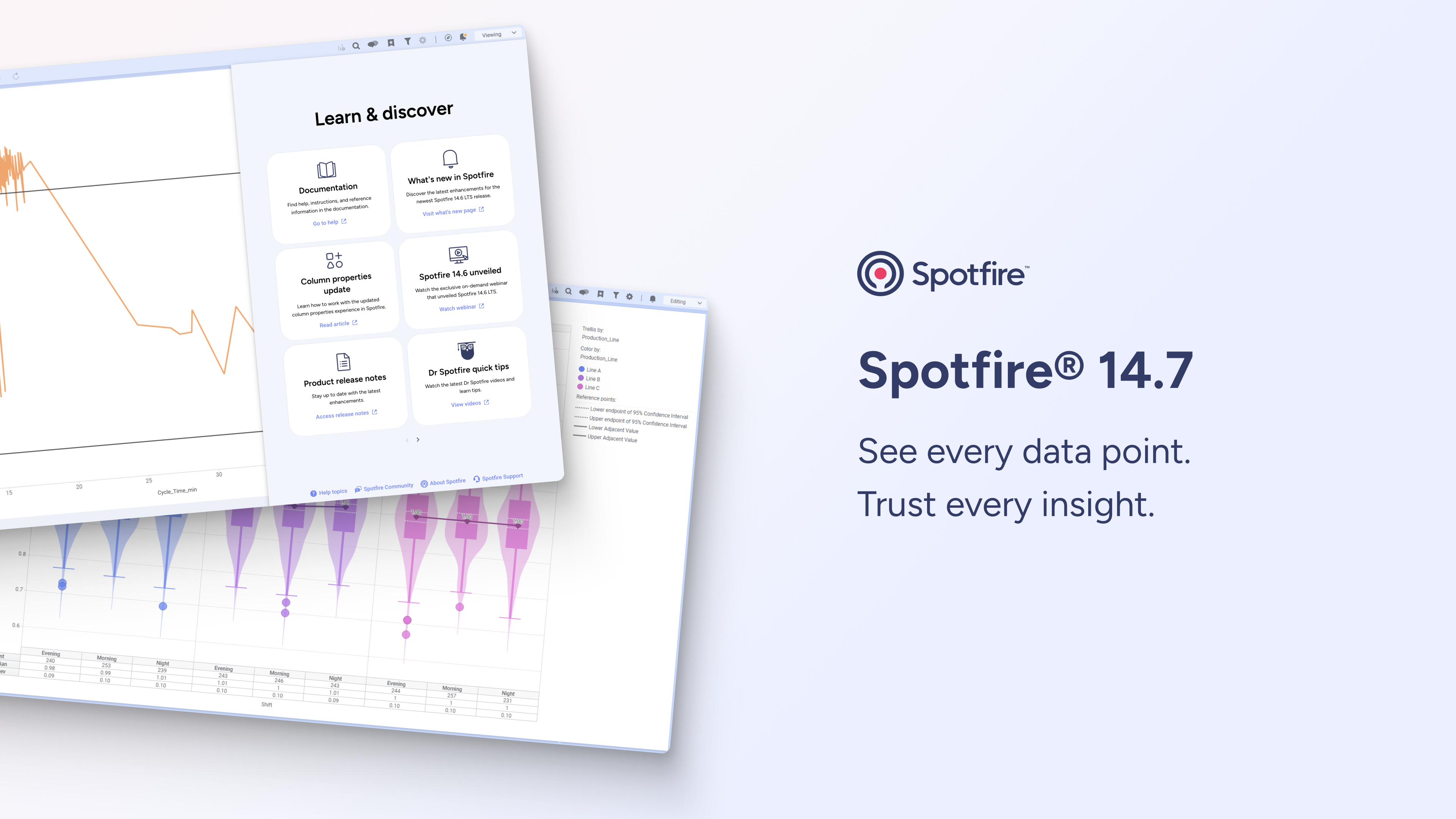 Spotfire® 14.7 continues our commitment to advancing visual data science by making analytics faster, clearer, and more intuitive across the entire platform. This innovation release strengthens the core visualization experience, modernizes connectivity, expands developer flexibility, and simplifies enterprise governance, helping organizations move from data to decisions with greater speed and confidence.